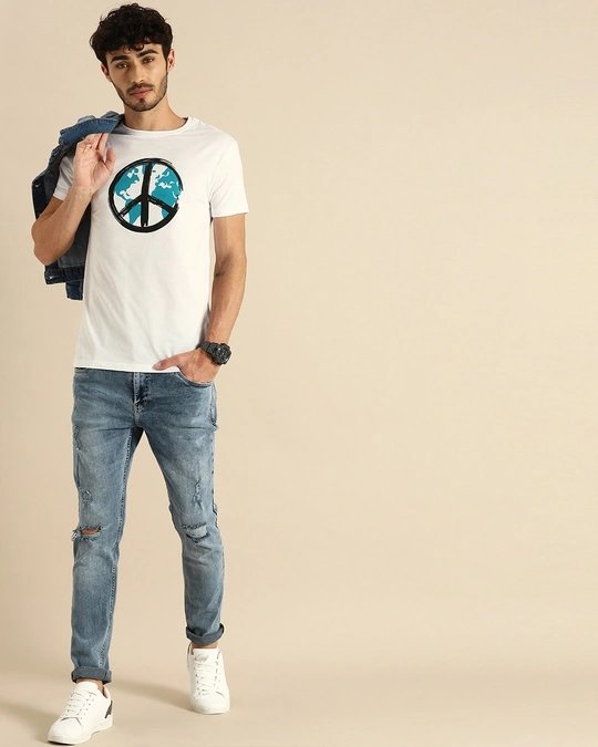 Spread some peace into the world by wearing this White Half Sleeve T-Shirt! You can easily pair it with any denim or shorts to complete the look. Best Quality.